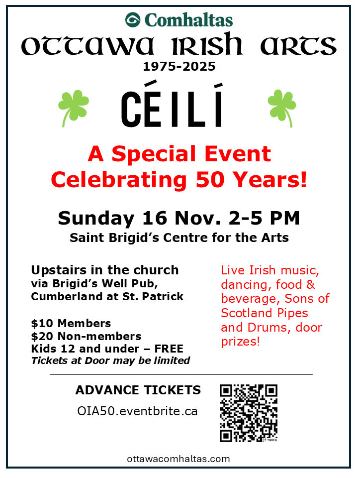 - Come and celebrate with us at our special céilí this November 16th 2025 from 2PM to 5PM at Brigid's Well Pub (310 Patrick Street, Ottawa, ON K1N 5K5, Cumberland Street entrance). There will be live traditional Irish music, social dances. Come and join us! Tickets are available in advance via Eventbrite.